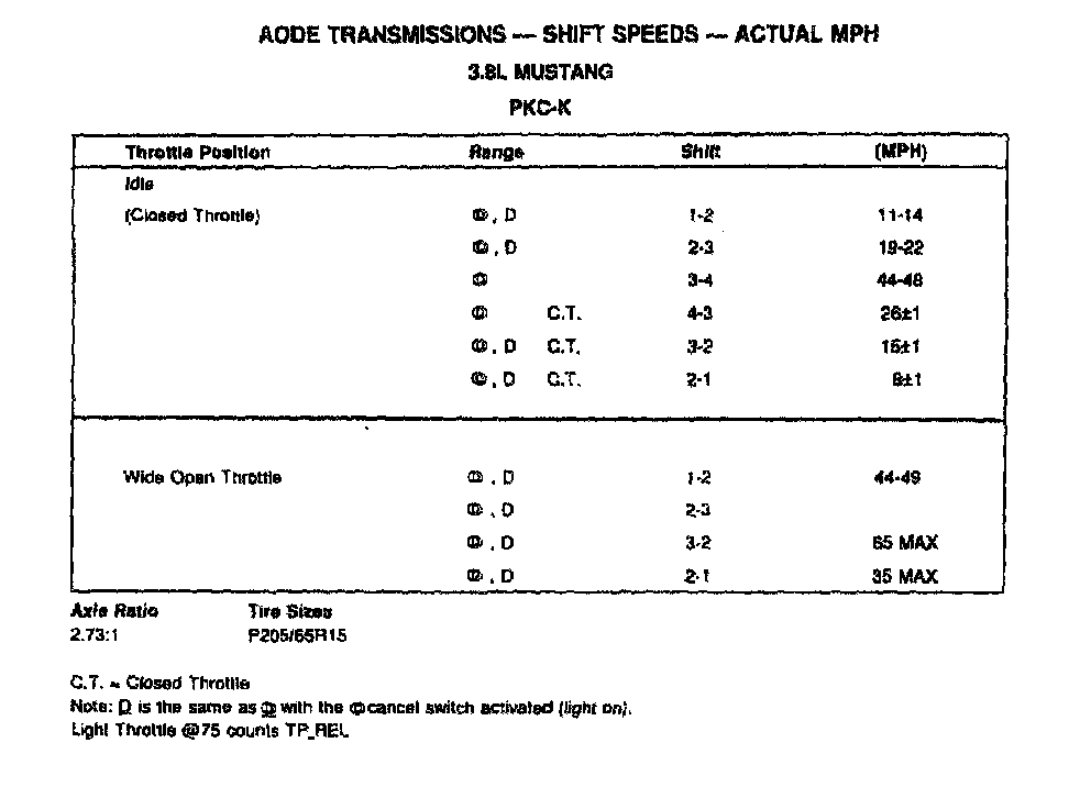 AODE 4-spd A/T, Shift Speeds (3.8L Mustang):