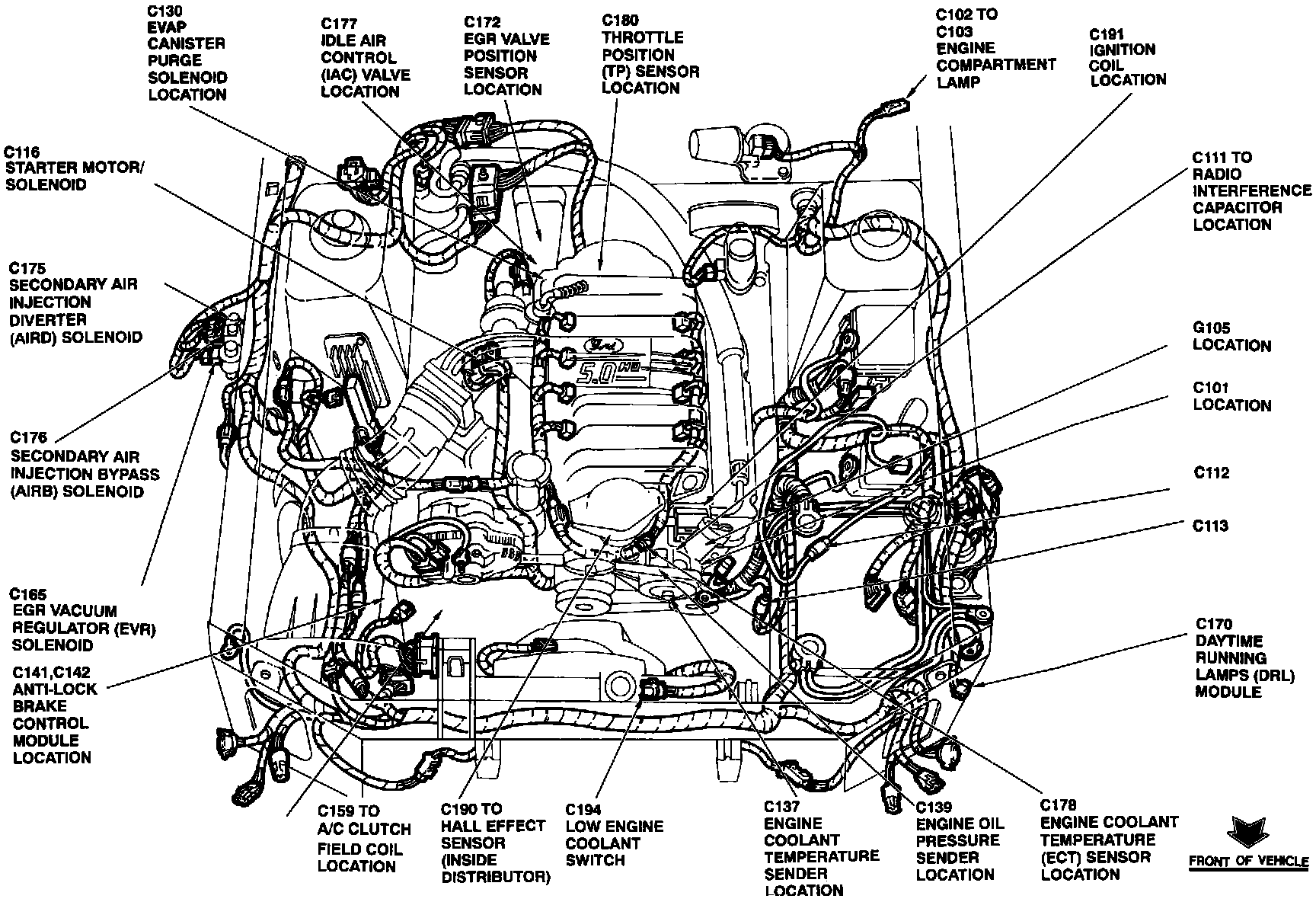 The Engine Coolant Temperature Sensor is located at the top RH front of the engine, in front of fuel injector No. 1.