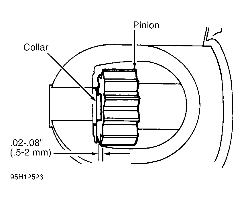 2. With pinion extended, measure gap between pinion and collar. Gap should be .02-.08" (.5-2.0 mm). See Fig 1 . If gap is not within specifications, add or subtract shims between solenoid and drive end housing as necessary. Reconnect solenoid terminal "M".