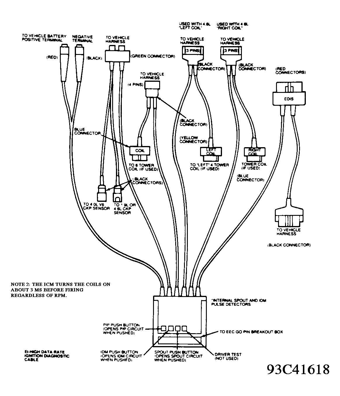 Use EI Diagnostic Cable (Rotunda 007-00059) to diagnose this system. Cable is equipped with additional circuits and components used to enhance and modify signals for testing purposes. If an aftermarket test cable is used or diagnosis is being performed using only a DVOM, become familiar with system wiring diagram and system operation.