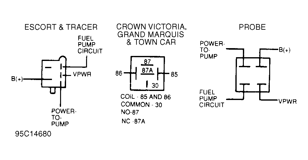 Turn ignition off. Disconnect fuel pump relay. Set DVOM on 200-ohm scale. Measure resistance between VPWR pin and FUEL PUMP circuit pin at fuel pump relay. See Fig 1. Reading should be 40-120 ohms. Set DVOM to 10-k/ohm scale. Measure resistance between FUEL PUMP circuit terminal and POWER-TO-PUMP pin and B+ pin at fuel pump relay. If all readings are more than 10,000 ohms, relay is okay. If any reading is 10,000 ohms or less, replace fuel pump relay.