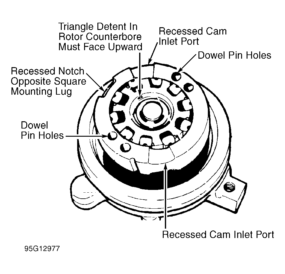 2. With rotor extended approximately halfway out of cam, insert one spring and slipper (groove facing cam) into one rotor cavity beneath recessed cam flats. Repeat procedure on opposite cavity.