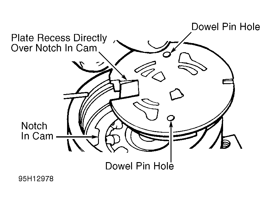 7. Place upper pressure plate over dowel pins with recess directly over recessed notch on cam insert and approximately 180 degrees opposite square mounting lug. See Fig 2 .
