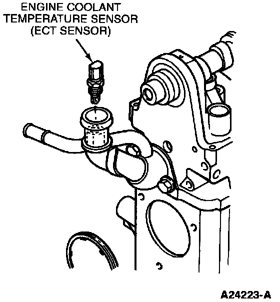 The Engine Coolant Temperature Sensor is located at the top RH front of the engine, in the water outlet tube.
