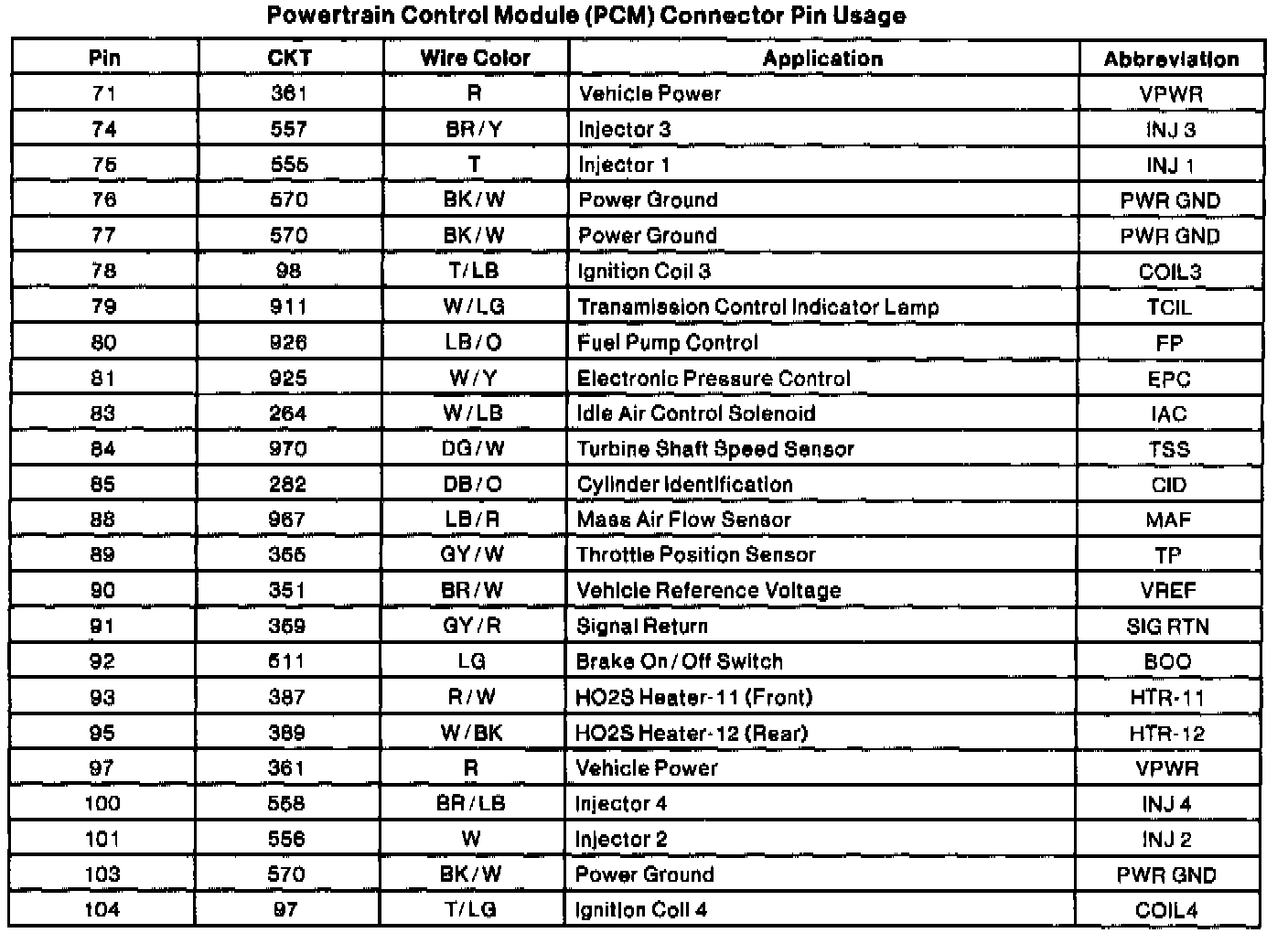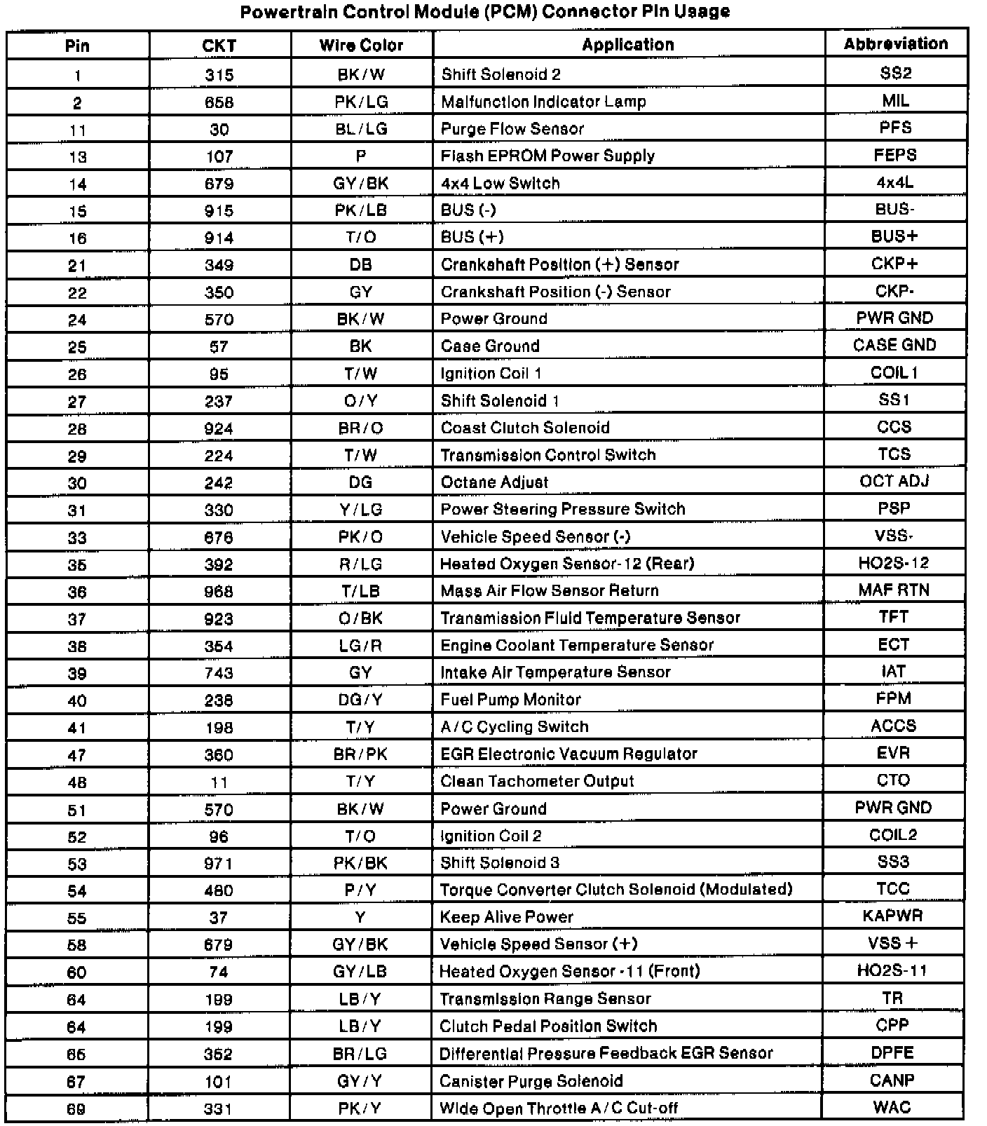 Powertrain Control Module (PCM) Connector Pin Usage (Part 2 Of 2):