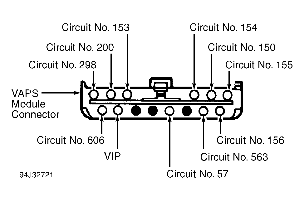 Circuit No. (Wire Color) Function Volts (DC) 57 (Black) Ground Less Than .1 150 (Dark Green/White) Speed Sensor (1) 153 (Purple/Yellow) Actuator Less Than .1 154 (Purple/Light Green) Actuator Less Than .1 155 (Gray/Red) Actuator Less Than .1 156 (Gray/Orange) Actuator Less Than .1 200 (Brown) Diagnostic Less Than .1 298 (Purple/Orange) Power Battery 563 (Orange/Yellow) Speed Sensor (1) 606 (White/Light Blue) Diagnostic Less Than .1 Blank VIP Less Than .1 (1) Specification is not available. - VAPS Harness & Connector Test