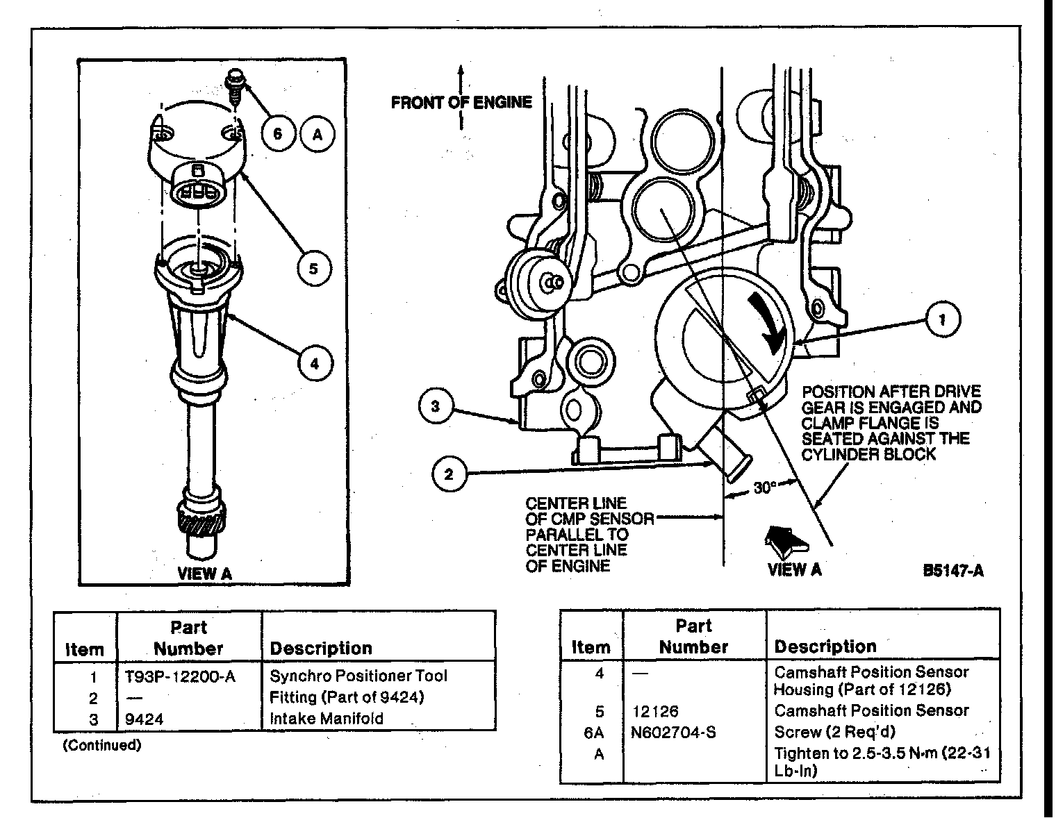 CAUTION: If the replacement camshaft position sensor housing does not contain a plastic locator cover tool, a special service tool such as Syncro Positioning Tool T93P-12200-A must be obtained prior to installation of the replacement camshaft position sensor. Failure to follow this procedure will result in improper camshaft position sensor alignment. This will result in the ignition system and fuel system being out of time with the engine, possibly causing engine damage.