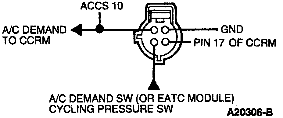 Home >> Ford >> 1995 >> Taurus V6-182 3.0L FF >> Repair and Diagnosis >> Powertrain Management >> Computers and Control Systems >> Testing and Inspection >> Pinpoint Tests >> X - Constant Control Relay Module (CCRM) >> X65 - Check Dual Function A/C Pressure Switch Input