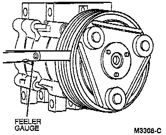 A/C CLUTCH AIR GAP1. Measure the air gap between the A/C clutch and the A/C clutch pulley mating surfaces at three equally spaced locations with a feeler gauge. Record the measurements.