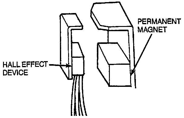 4. When the window of the vane cup is between the magnet and the Hall effect device, a magnetic flux field is completed from the magnet through the Hall effect device and back to the magnet.