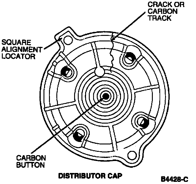 Clean both inside and outside surfaces of the distributor cap with soap and water. Dry distributor cap with compressed air. Inspect distributor cap for cracks, broken carbon button, or carbon tracks. Also, inspect distributor cap terminals for dirt and corrosion. Replace the distributor cap if it is worn or damaged.