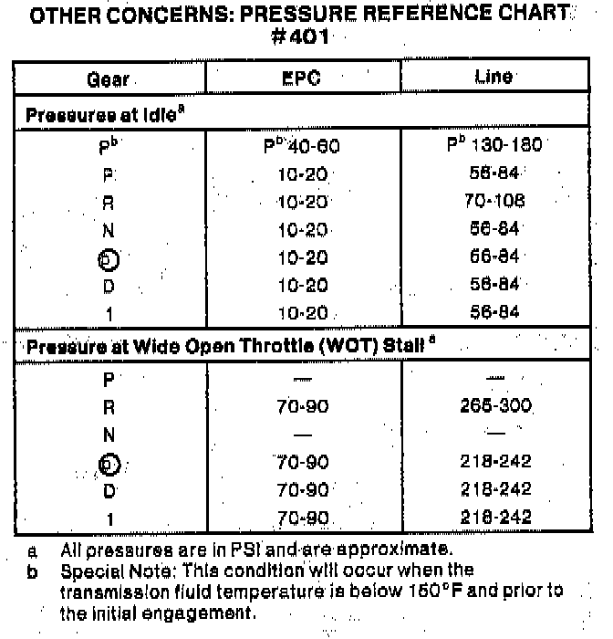 - Start the engine and check EPC pressure. Refer to the Line Pressure Specification Chart previously shown for specifications.
