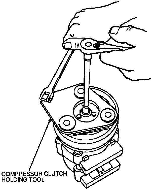 1. Hold the A/C clutch with the Compressor Clutch Holding Tool T94P-19703-AH and remove the A/C clutch retaining bolt.