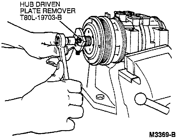 2. Remove the clutch hub and shims from the compressor shaft with the Hub Driven Plate Remover T80L-19703-B or equivalent. Hold the tool with a 1-inch wrench and tighten the bolt with a 1/2-inch wrench to pull the hub from the compressor shaft.