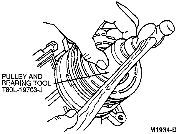 2. Install the pulley and bearing on the compressor. The bearing is a slip fit on the compressor head and, if properly aligned, it should slip on the compressor head. If difficulty is encountered installing the pulley, gently tap the pulley on the compressor using the Pulley and Bearing Tool T80L-19703-J. Ensure the pulley bearing is aligned with the compressor head.
