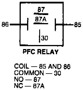 - Check PFC relay for internal shorts by measuring resistance between Pin 85 and Pins 30 and 87 of the PFC relay. Both resistances should be greater than 10,000 ohms.