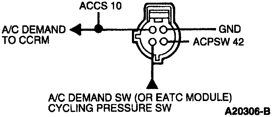 Home >> Ford >> 1995 >> Taurus V6-232 3.8L >> Repair and Diagnosis >> Powertrain Management >> Computers and Control Systems >> Testing and Inspection >> Pinpoint Tests >> X - Constant Control Relay Module (CCRM) >> X65 - Check Dual Function A/C Pressure Switch Input