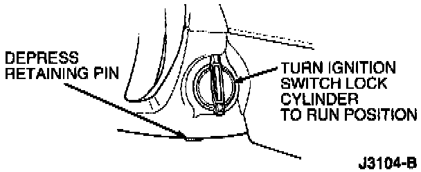 3. Place a 3.17 mm (1/8-inch) diameter wire pin or small drift punch in hole in lower steering column shroud under ignition switch. Press retaining pin while pulling out on ignition switch lock cylinder to remove it from steering column lock cylinder housing.