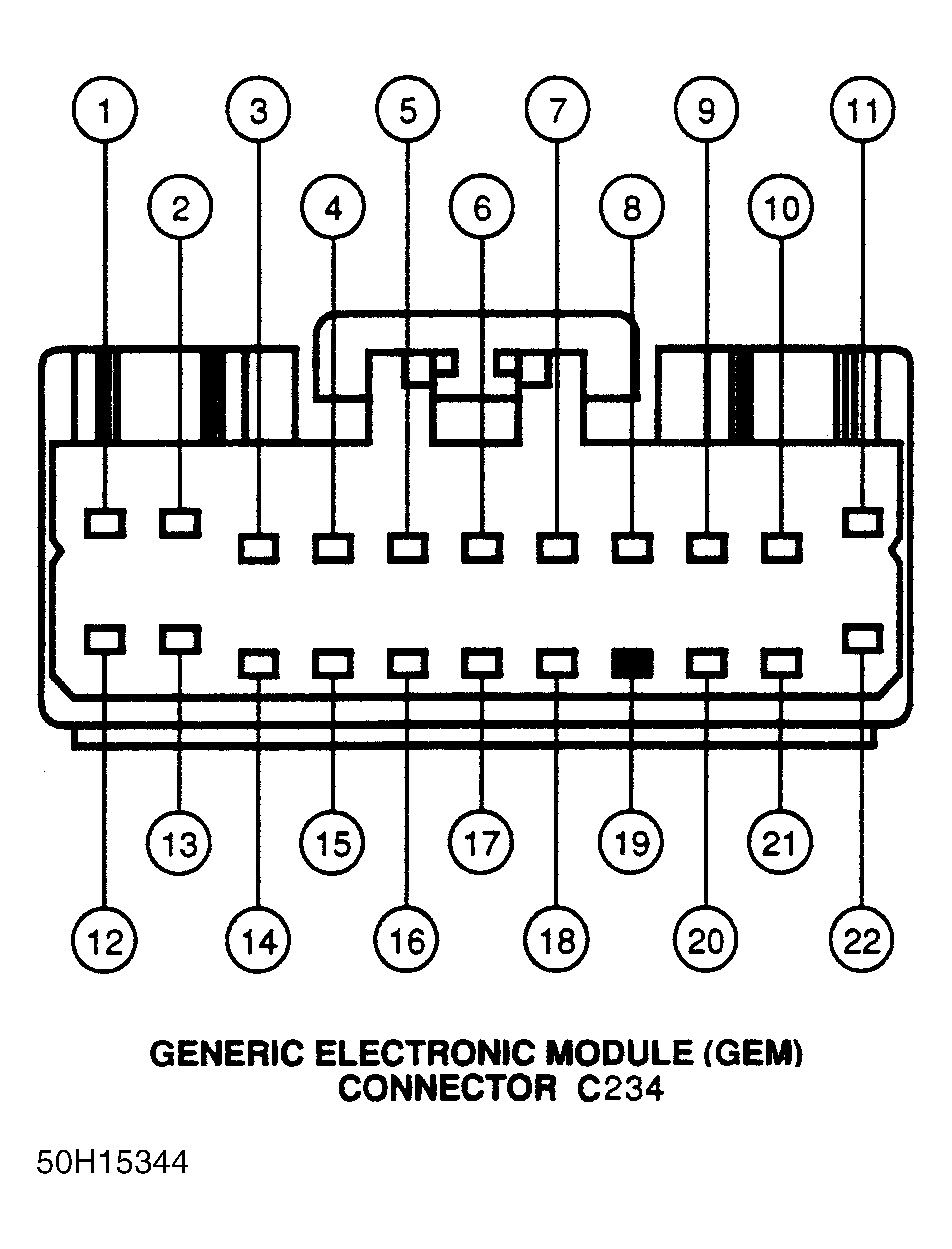 - Disconnect battery negative terminal. Check for intermittent continuity on Black/Light Green wire between fuse 19 and GEM connector J1 pin 13. See Fig 1