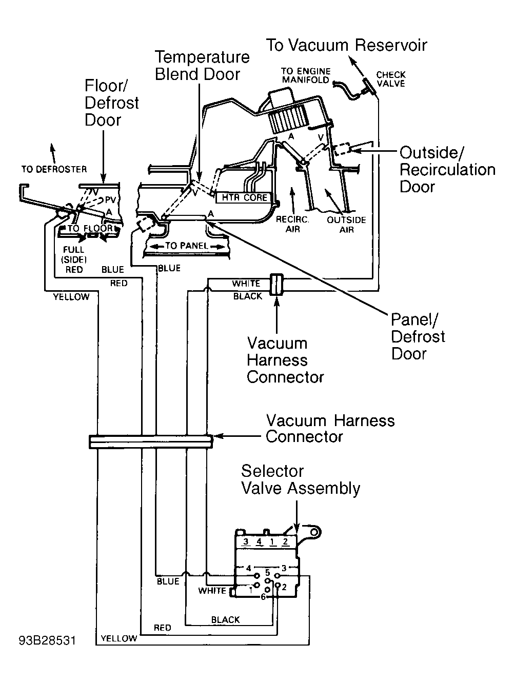 Place function selector knob in specified position. Using a vacuum gauge, check for presence or absence of vacuum and compare to VACUUM DISTRIBUTION table. If test results are not as specified, check for kinked or broken vacuum lines. If vacuum lines are okay, replace function selector valve. See Fig 1 .
