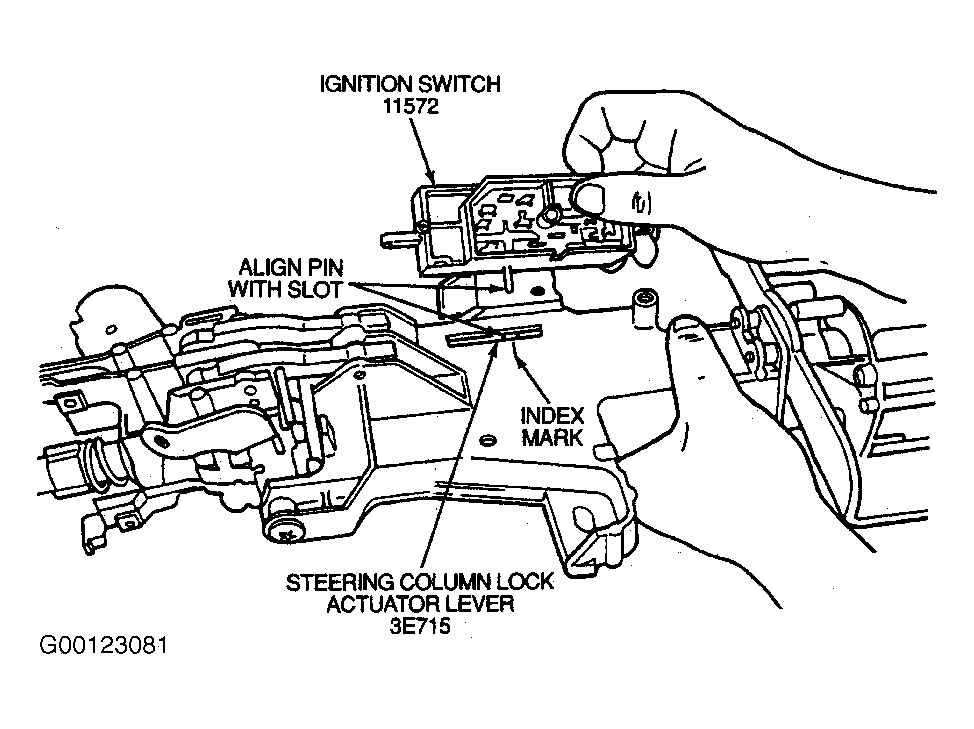 - Install ignition switch. Align pin from ignition switch with slot in lock/column assembly. Position slot in lock/column assembly with index mark on casting. Ignition switch should be in RUN position. See Fig 9 .