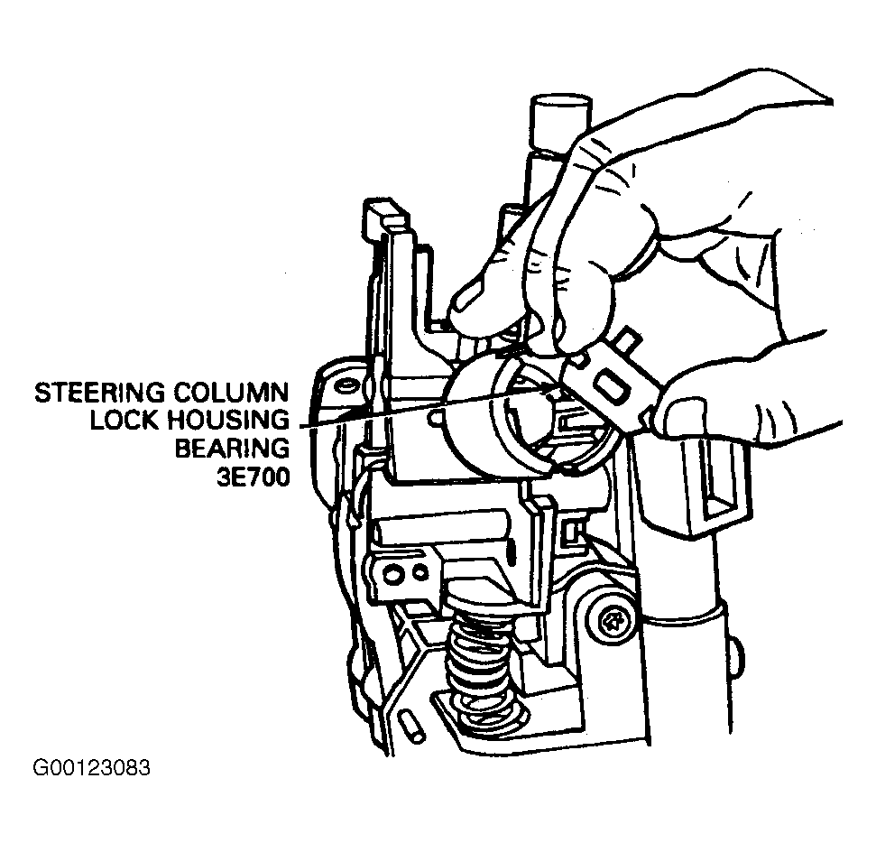- Lubricate steering column lock housing bearing. Lubricate with F0AZ-19584-A (ESA-M1C232-A) grease or equivalent. With actuator rack in 12 o'clock position, position bearing with tang inboard and in 5 o'clock position in lock cylinder. Insert tip of a screwdriver into double-D slot of bearing, then turn counterclockwise 90 degrees. See Fig 11 .