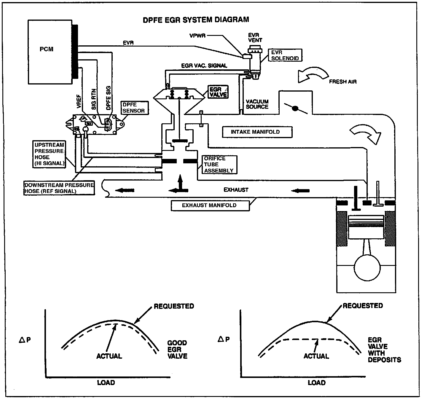 The EGR monitor will continuously check the integrity of the DPFE sensor and circuit to the PCM. If the DPFE sensor voltage input is within the operating range, the DPFE sensor becomes the tool for the remaining EGR system checks: