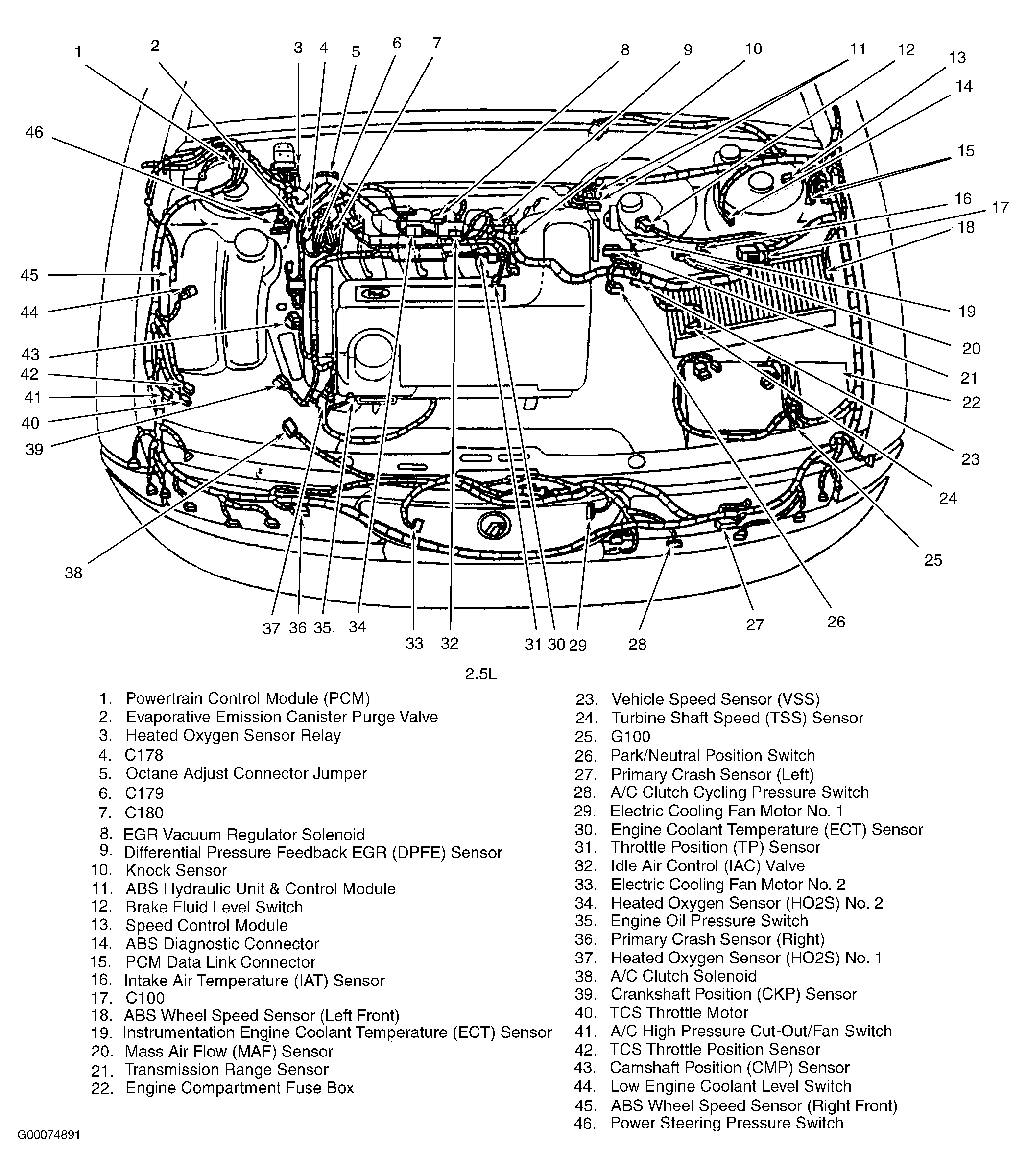 Powertrain Control Module (PCM) (2.5L) In right rear corner of engine compartment, behind power steering reservoir. See Figure .