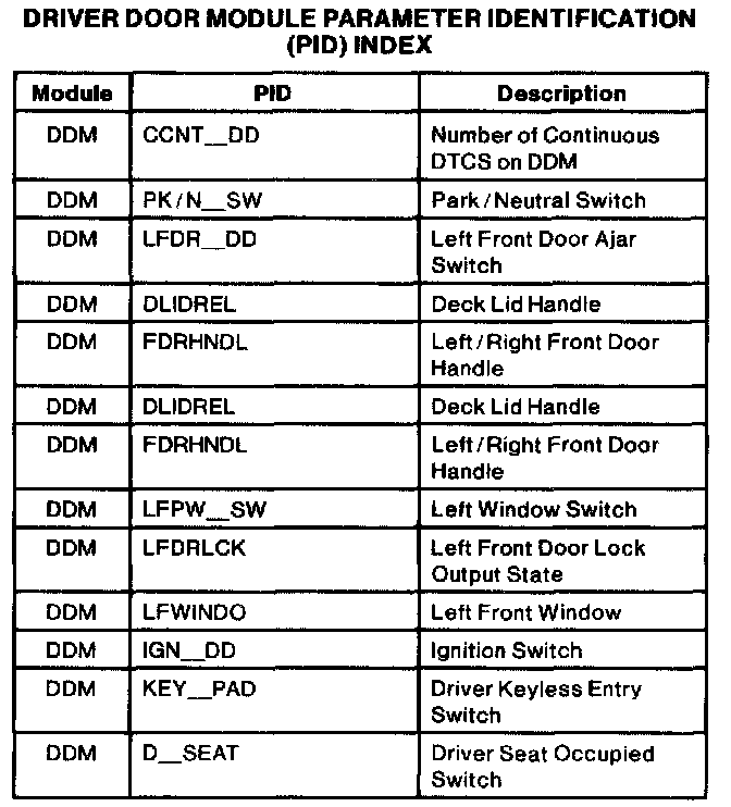 Driver Door Module (DDM) Parameter Identification (PID) Index