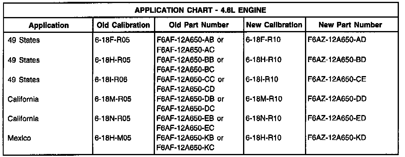 2. Reprogram the PCM by following the SBDS reprogramming tool, January, 1996 CD-ROM or later. If SBDS is not available, replace the PCM. Dealers with SBDS are required to reprogram the PCM with the appropriate calibration per the Application Chart. Only non-SBDS dealers are permitted to replace the PCM. Refer to the Application Chart for correct calibration or part number.