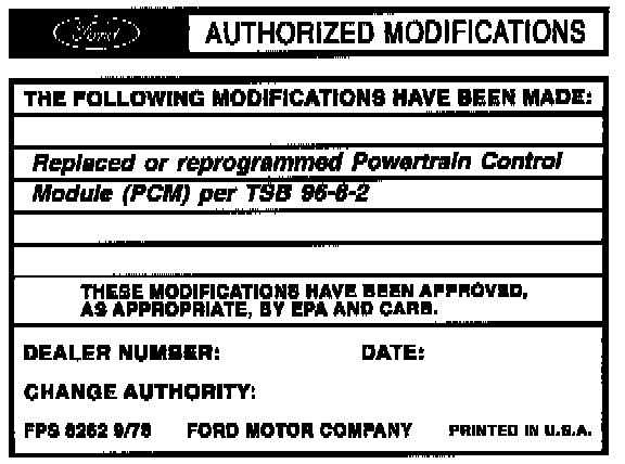 Obtain an Authorized Modifications Decal and list the date, dealer number, and summary of modifications performed. Select a prominent place adjacent to the Vehicle Emission Control Information Decal suitable for installing the Authorized Modifications Decal. Clean the area, install the decal, and cover it with a clear plastic decal shield.