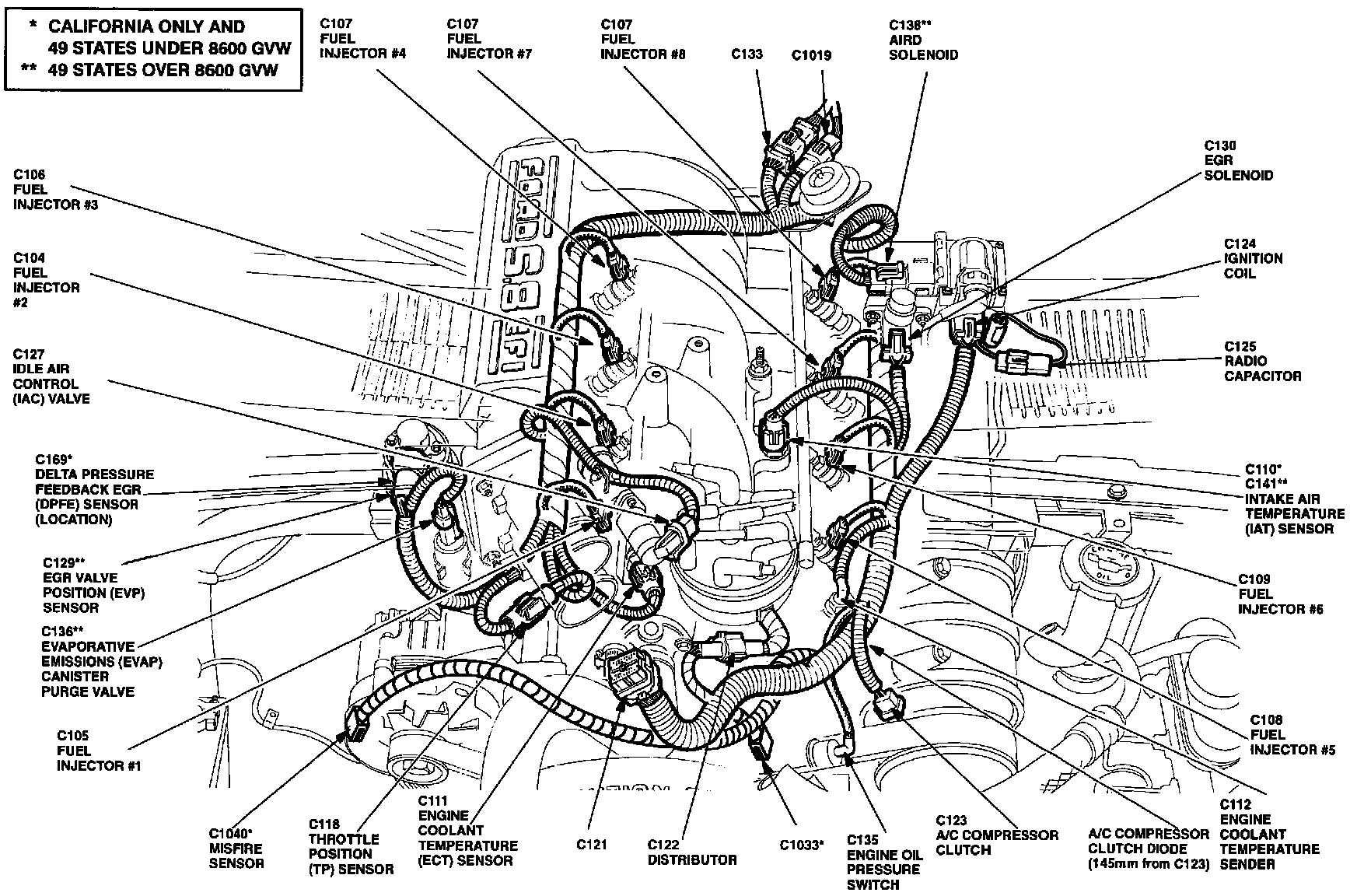 The Engine Coolant Temperature Sensor is located on the top front of engine, near distributor, on heater tube.