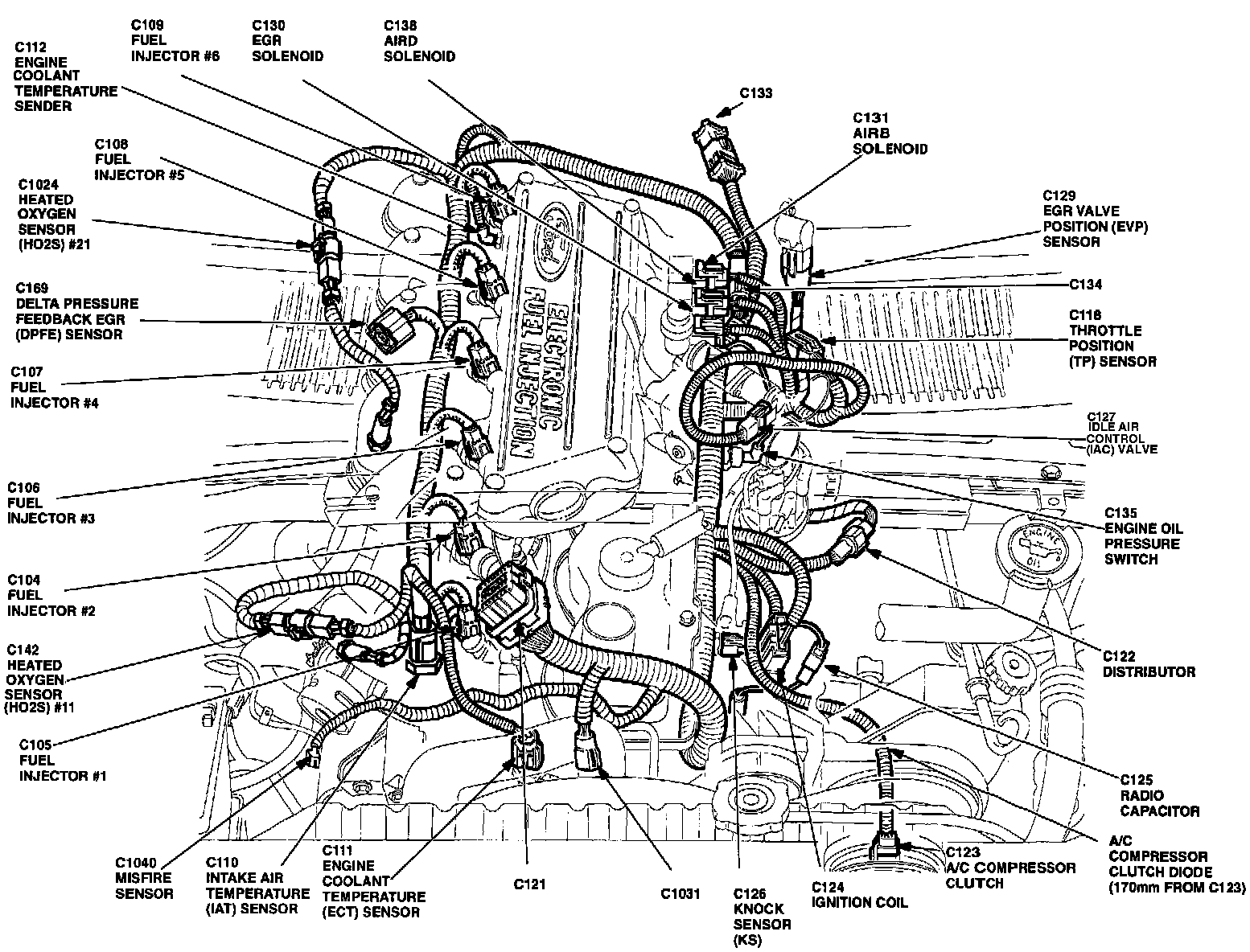 The Engine Coolant Temperature Sensor is located on the top front of engine, on heater outlet elbow.