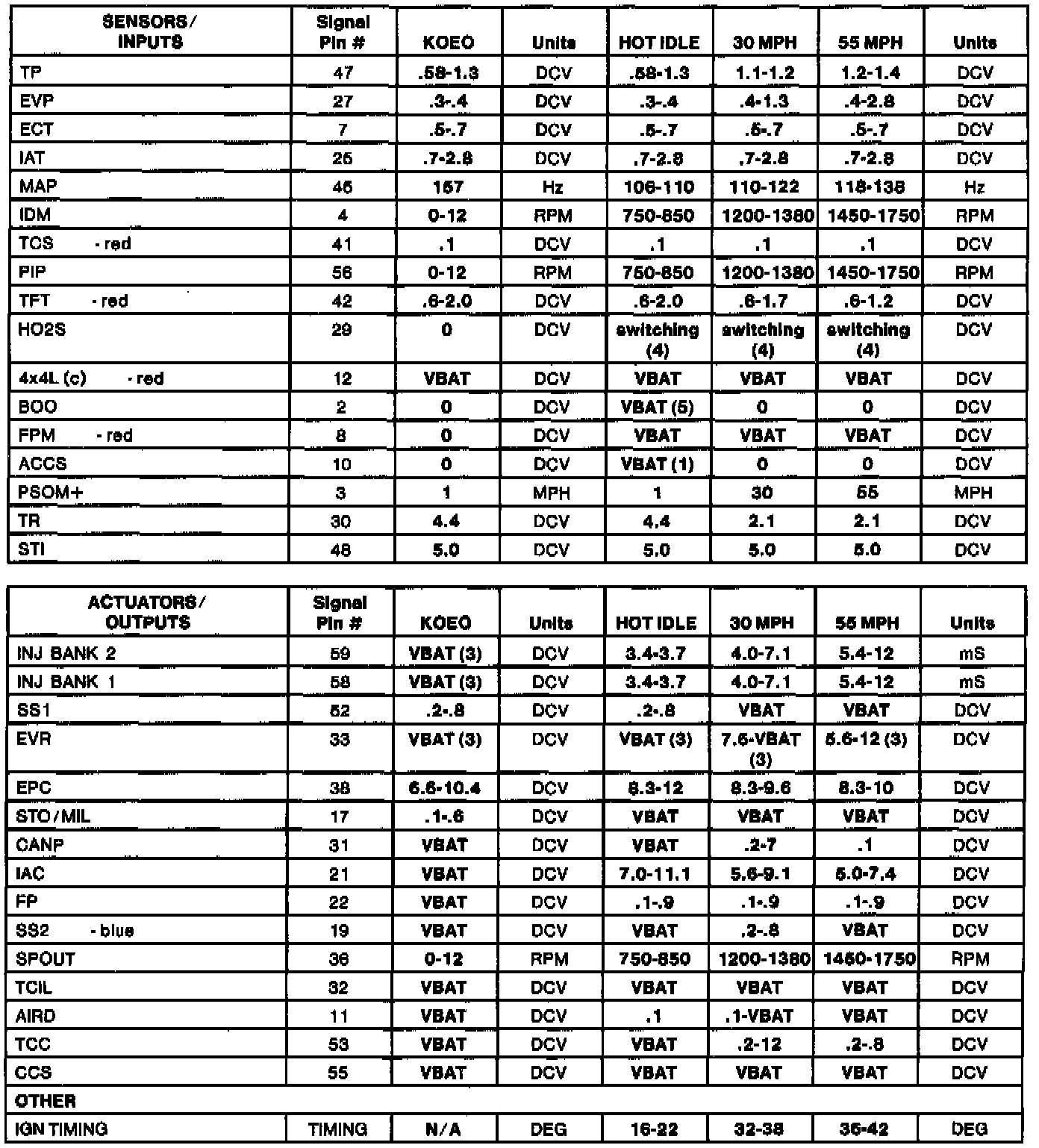 5. Reference values shown in chart may differ between vehicles due to various factors: component tolerances, driving conditions, weather, etc. These values were recorded at approximately 600 feet altitude above sea level and ambient temperatures from 50 to 70 degrees F. Some EEC devices, such as IAT, ECT are temperature dependent and values may vary. Other values such as IAC and INJ are calibration dependent and may vary also.