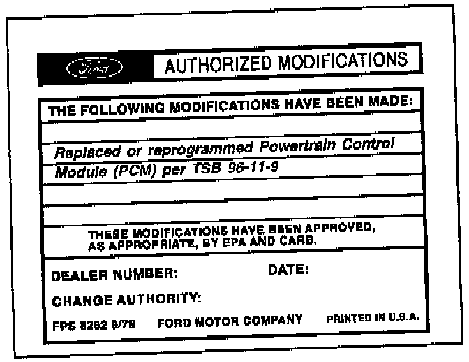 Obtain an Authorized Modifications Decal and list the date, dealer number, and summary of modifications performed. Select a prominent place adjacent to the Vehicle Emission Control Information Decal suitable for installing the Authorized Modifications Decal. Clean the area, install the decal, and cover it with a clear plastic decal shield.