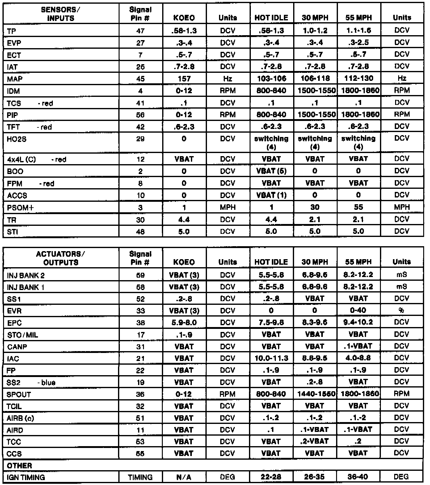 5. Reference values shown in chart may differ between vehicles due to various factors: component tolerances, driving conditions, weather, etc. These values were recorded at approximately 600 feet altitude above sea level and ambient temperatures from 50 to 70 degrees F. Some EEC devices, such as IAT, ECT are temperature dependent and values may vary. Other values such as IAC and INJ are calibration dependent and may vary also.