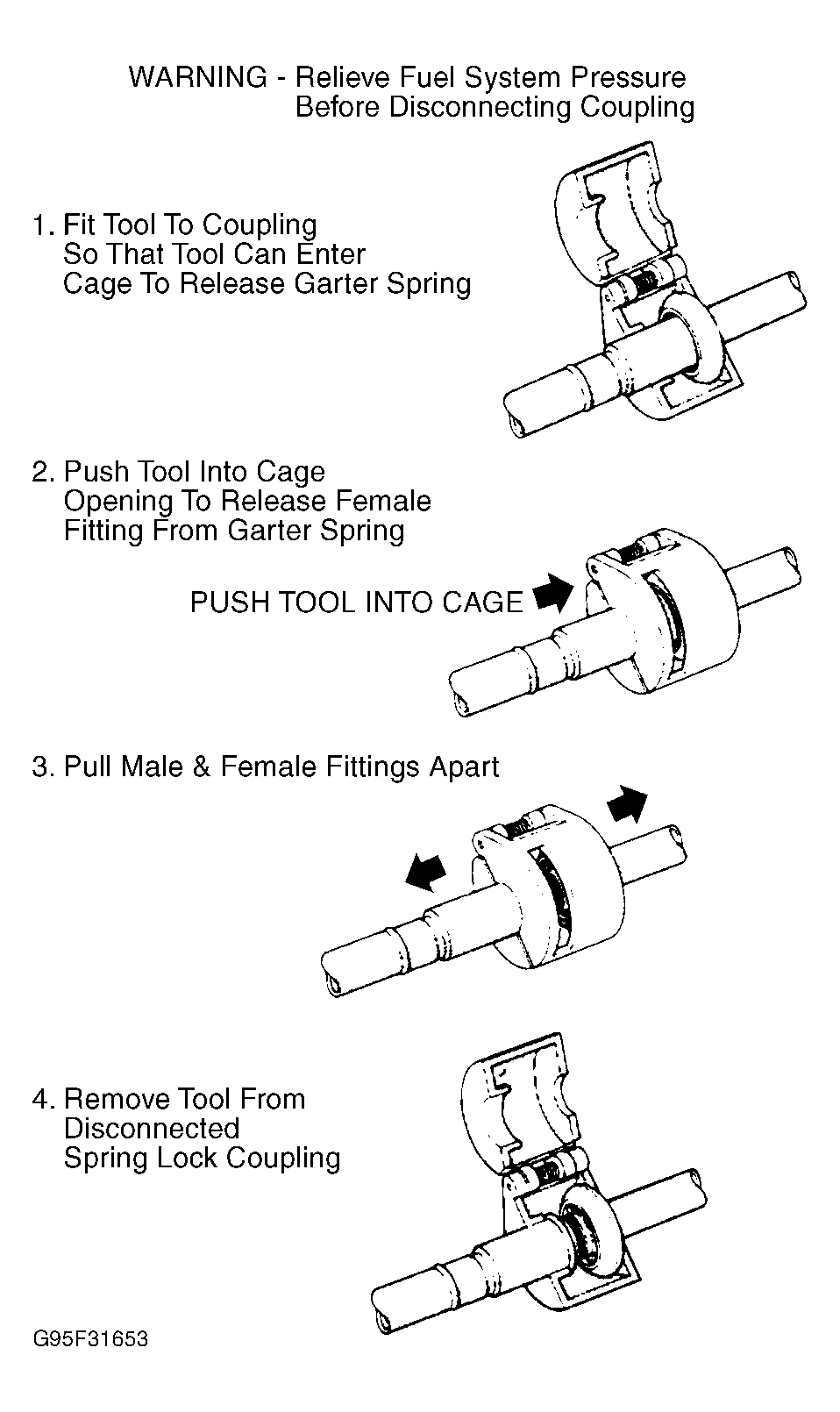 - Push spring lock coupler releaser to release female fitting from garter spring. Pull spring lock coupler apart. Remove releaser.