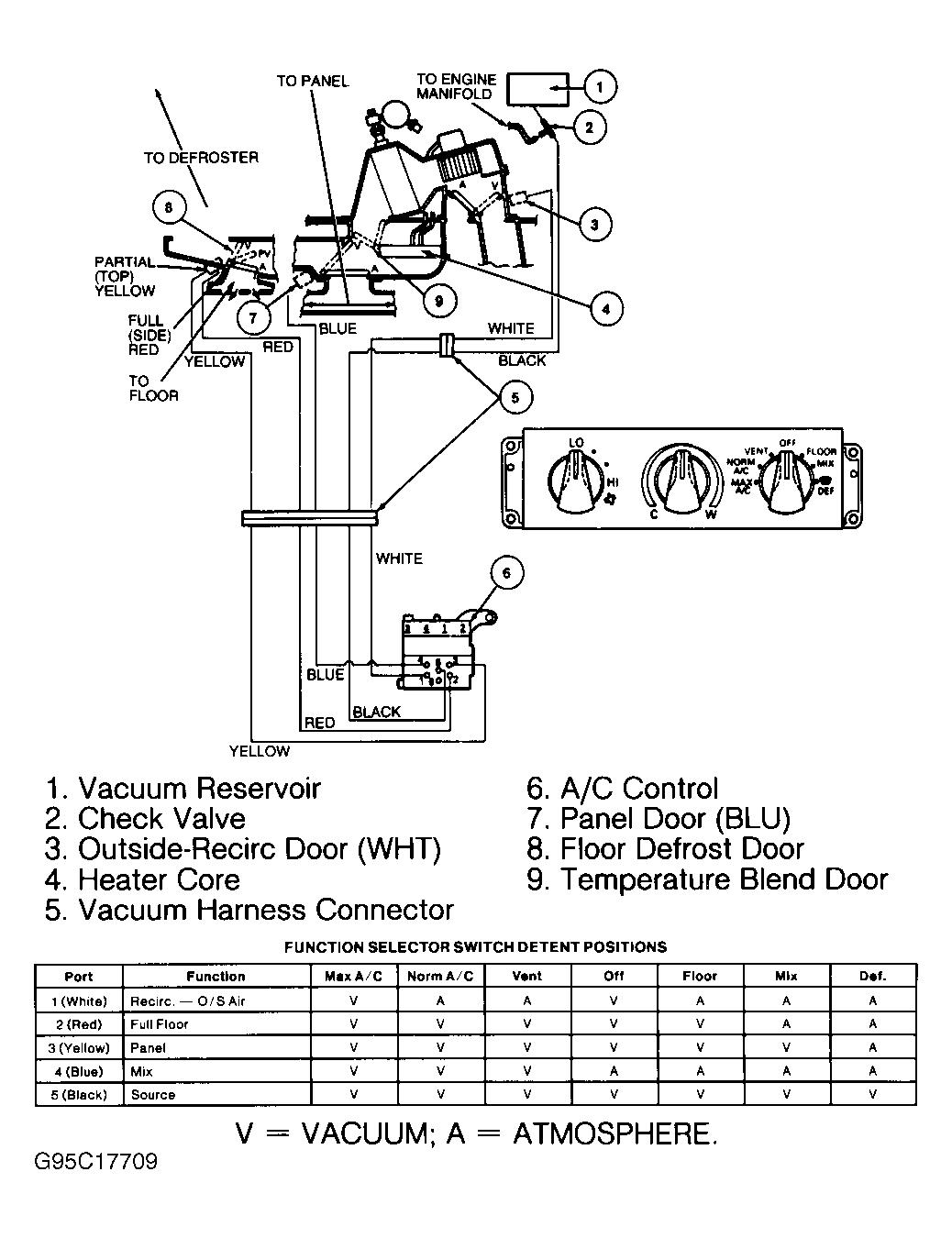 The function control knob actuates a vacuum selector valve, which directs vacuum to open and close vacuum motor-controlled doors. With knob in NORM A/C, VENT, FLOOR, MIX or DEF (defrost symbol) position, outside air is drawn into system by the blower. With knob in OFF or MAX A/C position, the outside/recirculation door is positioned so outside air cannot pass into evaporator case. See Figure.