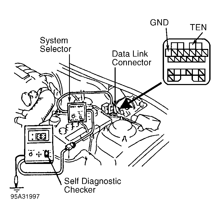 - Use Self Diagnostic Checker (49 H018 9A1) and System Selector (49 B019 9A0) to retrieve trouble codes. Connect one lead of self diagnostic checker to ground and the other to system selector. Connect system selector to data link connector. See Fig 1 .