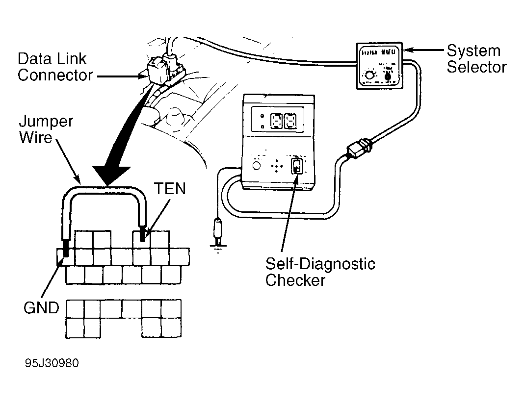 1. If system selector is not available, connect a jumper wire between terminals TEN and GND of data link connector. See Fig 1 . Observe Malfunction Indicator Light (MIL). Note trouble codes. Check TROUBLE CODE IDENTIFICATION  chart for possible cause.
