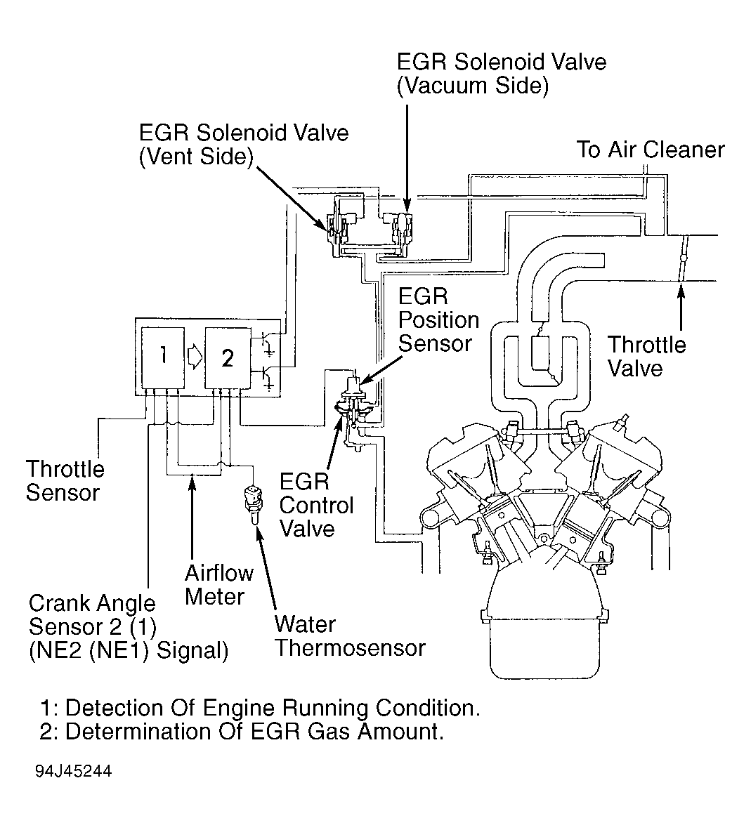Check all connectors and hose routing. Check for cracks, leakage and restrictions, and repair as necessary. Start engine and operate throttle. Diaphragm of EGR control valve should not move while engine is cold. Warm engine to operating temperature. Increase engine speed to about 2000 RPM, EGR control valve diaphragm should move. If no movement is detected, check EGR valve, solenoids and position sensor. See Fig 1 .