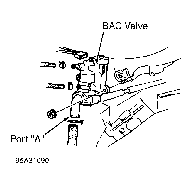 Start engine. Disconnect air hose from BAC valve at port "A". See Fig 1 . When engine is cold, air (vacuum) should pass through valve. When engine is warm, air should NOT pass through valve. Replace valve as necessary.