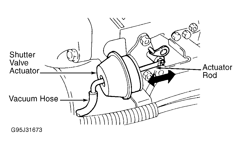 Connect tachometer to engine. Start engine, and let idle. Shutter valve actuator rod should be extended at idle. See Fig 1 . Gradually increase engine speed to 5000 RPM and ensure actuator rod retracts. If system actuator does not operate as described, check for vacuum leaks. If no vacuum leaks are detected, check shutter valve and shutter valve solenoid.