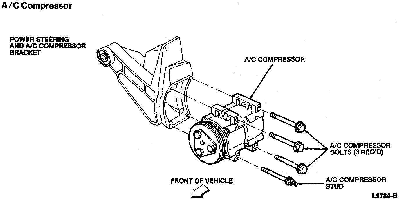 7. Remove the A/C compressor bolts and stud from the power steering pump and A/C compressor bracket.