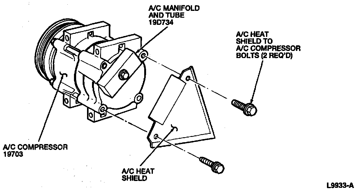1. Install the two A/C compressor heat shield bolts to rear of A/C compressor. Tighten A/C compressor heat shield bolts to 5.5-8.0 N.m (4-6 lb-ft).