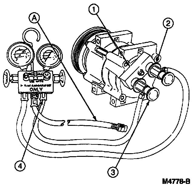2. Remove A/C manifold and tube from A/C compressor. Use care not to allow dirt to enter A/C compressor.