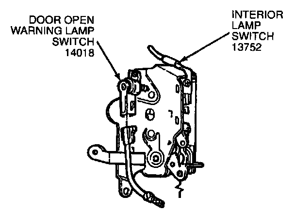 The interior lamp switch (13752) is a grounding type leaf switch and is attached to the front door latch (21812) by one screw.