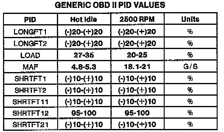 NOTE: All generic OBDII readings under no load (PARK or NEUTRAL).