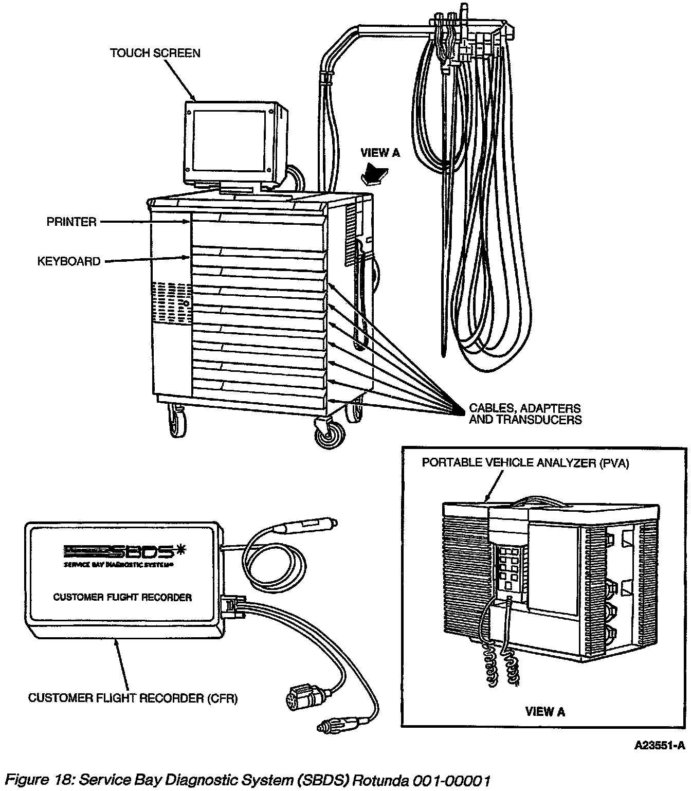 The Service Bay Diagnostic System (SBDS) is a tool that diagnoses intermittent driveability and engine performance concerns by testing vehicle systems. Results of the tests are displayed in items, tables and graphs to help identify powertrain and intermittent concerns. This stand-alone system contains universal testers and meters, specialized diagnostic tools, and guided diagnostics. OASIS, Electrical and Vacuum Troubleshooting Manuals (EVTMs), Powertrain Control/Emissions Diagnosis (PC/ED) manuals, and Technical Service Bulletins (TSBs) are also available on SBDS. These specialized tools are available on SBDS: