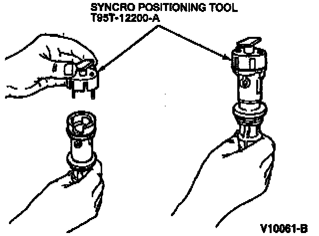 CAUTION: Syncro Positioning Tool T95T-12200-A must be obtained prior to installation of the replacement synchronizer assembly. Failure to follow this procedure will result in the fuel system being out of time with the engine, possibly causing engine damage.